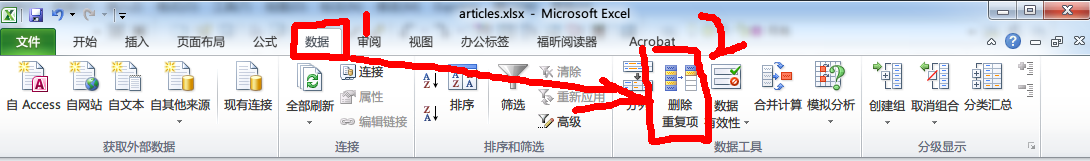 在“数据”选项卡“数据工具”组中找到“删除重复项”,使用就好了。